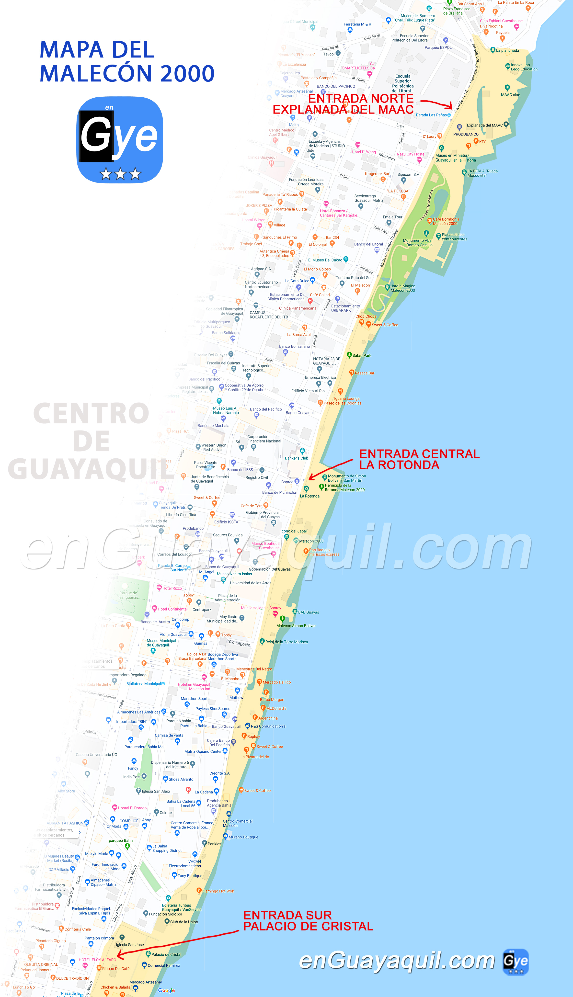 A continuación compartimos el mapa con los lugares más destacados del Malecón 2000 (Descargable). Para descargar en buena resolución, darle click al enlace debajo del mapa cuadrado.